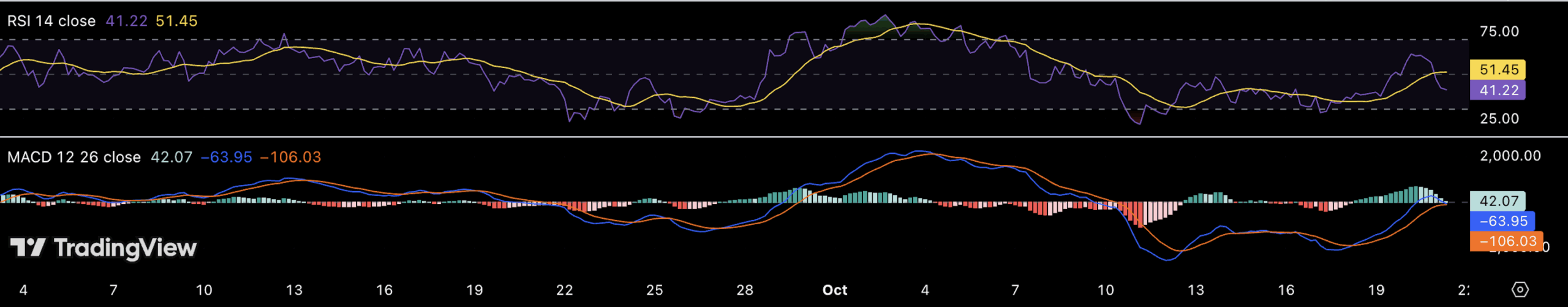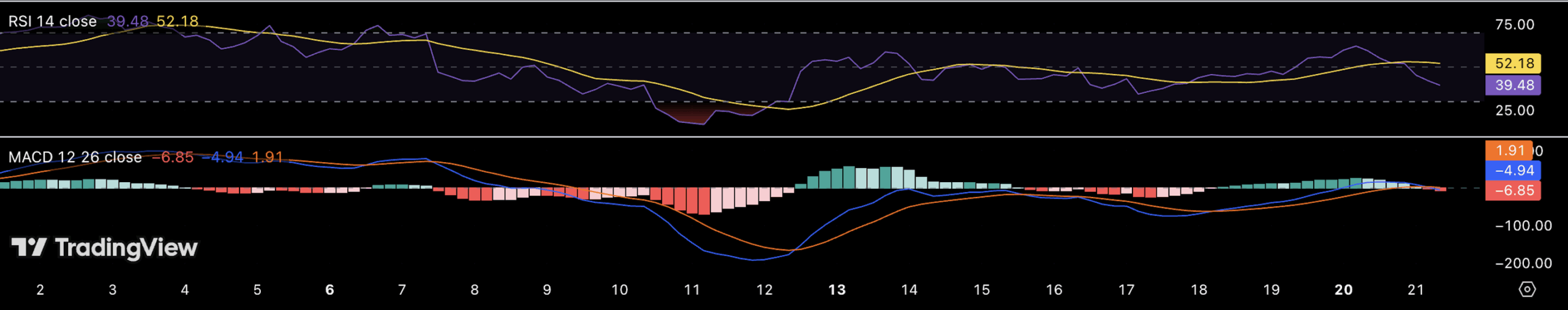 テクニカル指標は弱気を示す。RSIは40を下回り、下落モメンタムが続く可能性を示し、MACDはクロスオーバーを示しており、下方向圧力が依然優勢であることを示す。