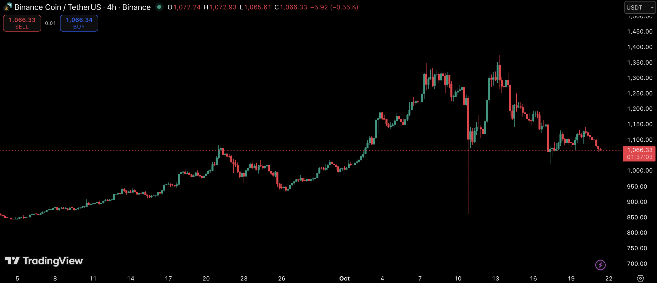 トップ10暗号資産の中でBNBは最大の下落幅を示した。過去24時間で4.7%、今週は10%以上下落し、現在約$1,070で推移している。