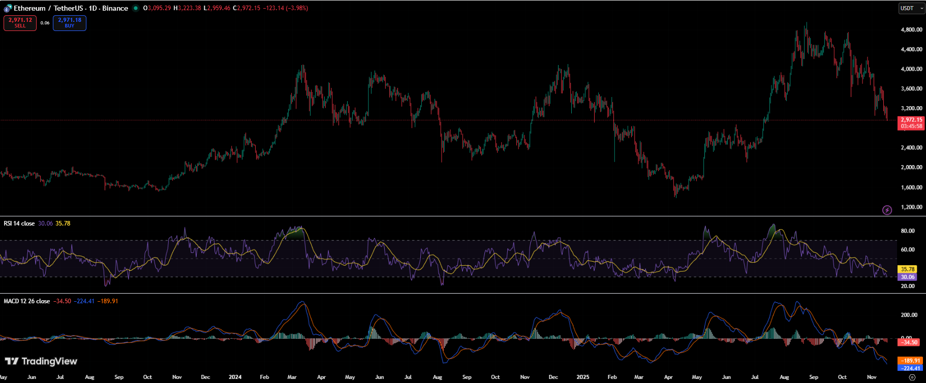 ETHは現在約2,966ドルで取引され、週間で17%下落。前四半期に蓄積された大部分の利益を消失している。この下落はデジタル資産全体に広がるリスクオフの流れと重なり、トレーダーは高信頼性資産でさえ積極的なロングを避ける傾向が強まっている。