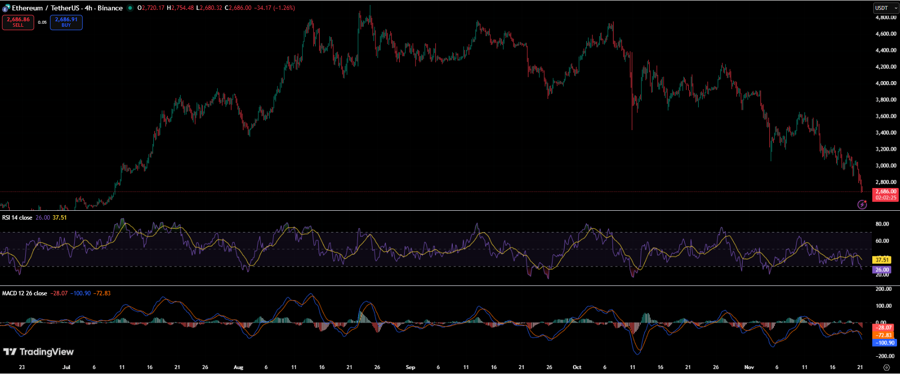 Ethereum은 올해 가장 어려운 국면 중 하나에 진입했으며, 또 다른 대규모 매도세 이후 $2,700 구간까지 하락했다.