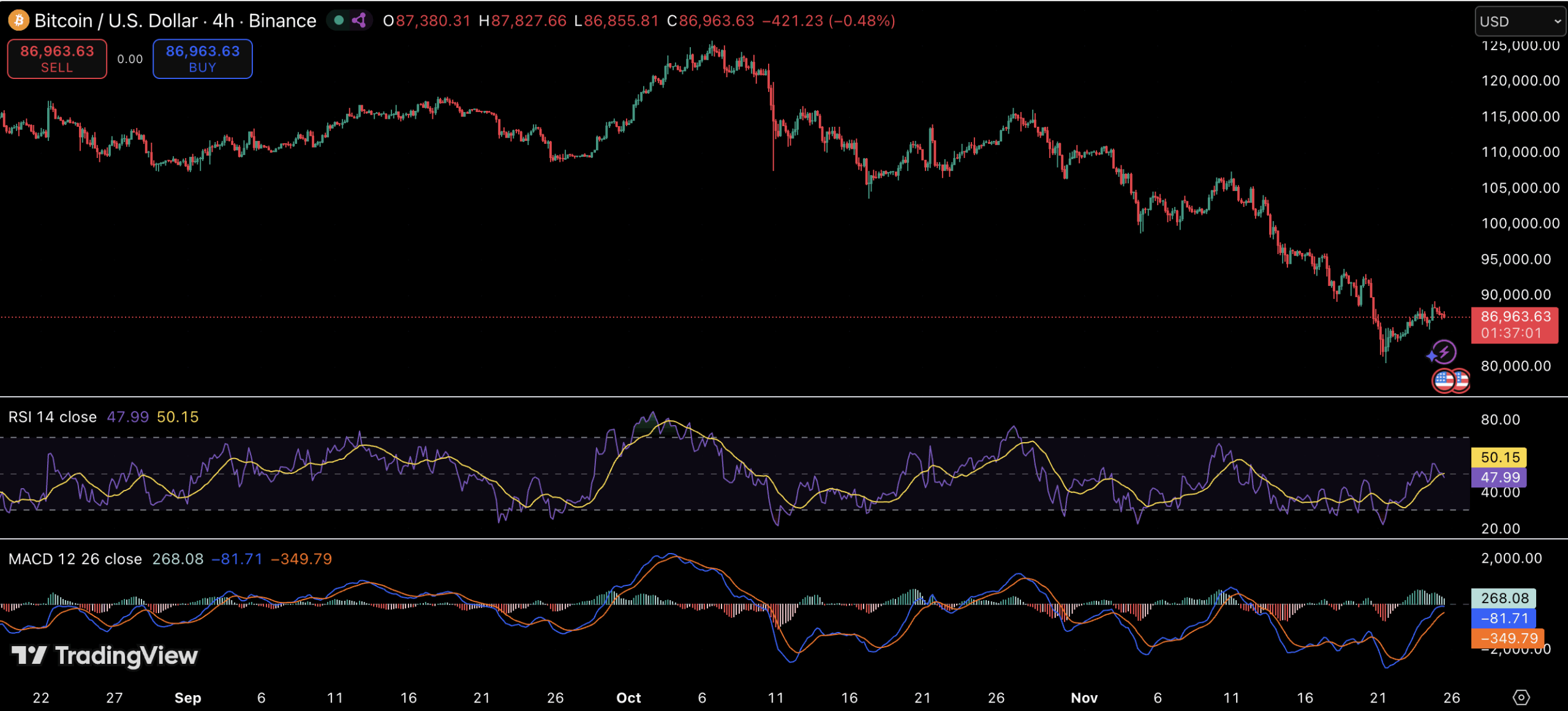 11월 최저점에 도달한 후, 비트코인은 주중 반등을 시도하며 수일간의 강한 매도 압력 이후 87,000달러 부근까지 회복했다.