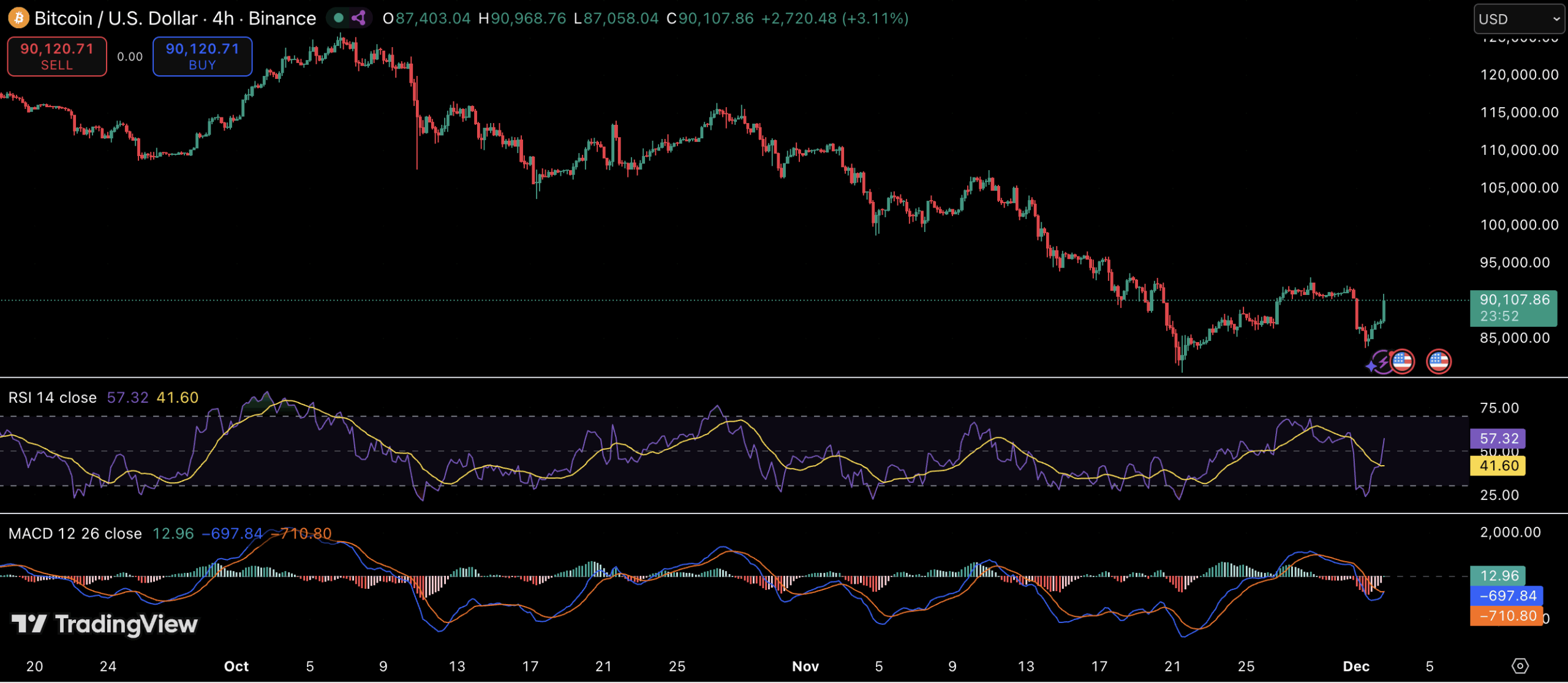 기술적 지표도 반등을 지지한다. 4시간 차트에서 RSI는 57로 복귀하며 중립-강세 영역을 회복했고, MACD 히스토그램은 상승으로 전환되기 시작하여 11월 말 이후 처음으로 약세 모멘텀 감소를 시사한다.