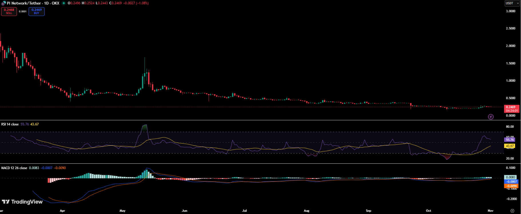 기술적 지표도 긍정적이다. MACD가 최근 골든 크로스를 형성하며 상승 모멘텀을 시사하고, RSI는 55 근처에서 균형 잡힌 매수세를 나타낸다. 이는 봄 이후 처음으로 Pi 코인 시장 구조가 개선되고 있음을 보여준다.