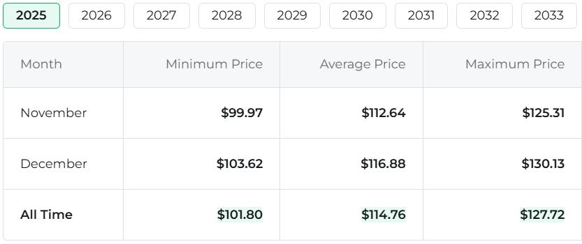 Projections show the LTC price may edge slightly higher in December 2025, assuming the November target is hit. Putting this in mind, Litecoin is expected to reach a minimum of $103.62, an average of $116.88, and a maximum of $130.13 in December.