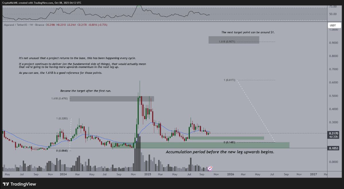 A detailed Fibonacci analysis shared by the popular analyst outlines a long-term target near $1, with key intermediate resistances at $0.48 and $0.62. The chart suggests that ALGO’s current range around $0.21-$0.22 represents a potential base formation zone before the next leg upward.