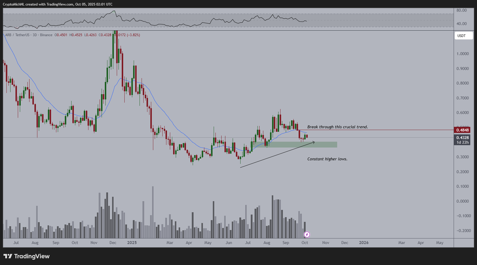 Arbitrum, a leading Layer-2 scaling solution for Ethereum, remains one of the ecosystem’s largest networks by total value locked. Its native token, ARB, has struggled to regain previous highs seen in early 2024, but analysts believe a confirmed breakout above $0.48 could reestablish bullish structure and attract renewed institutional and retail interest.