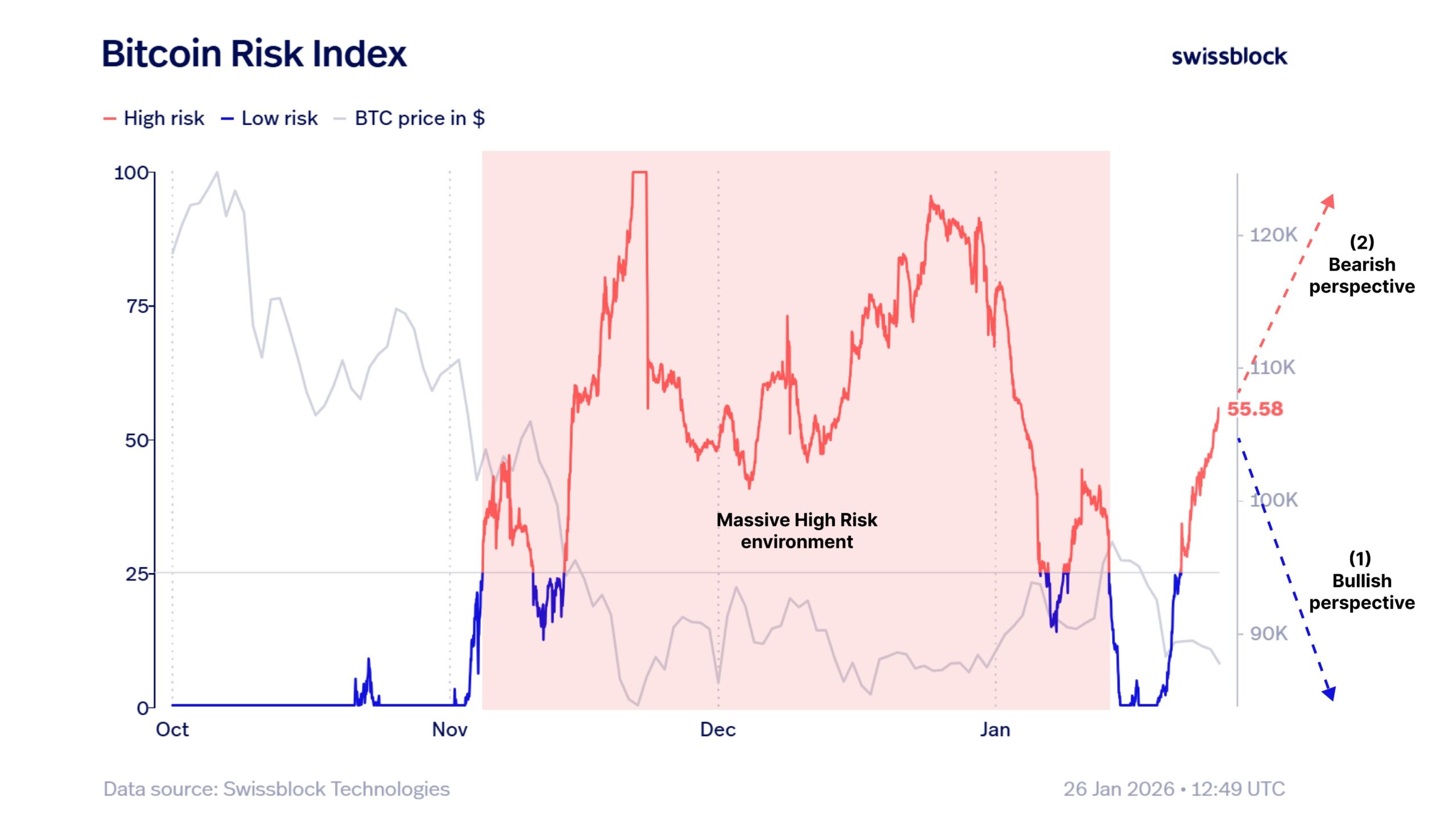 Recent price action has reinforced a bearish short-term outlook. Bitcoin lost the 89.2k support zone, a level that had acted as a pivot throughout January. At the same time, the Bitcoin Risk Index continued to rise, signaling a higher-risk environment and worsening sentiment.