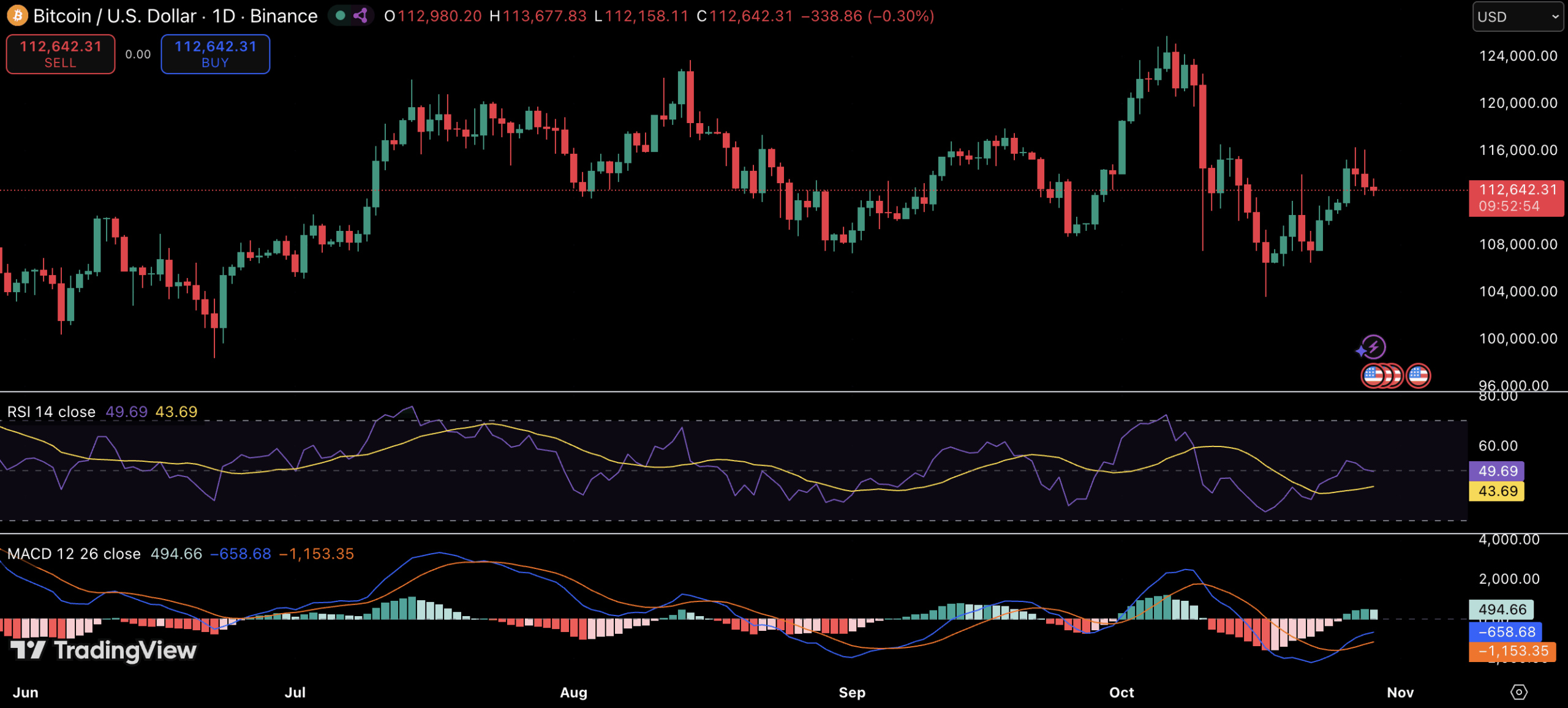 Bitcoin’s price hovered near $112,600 on Tuesday after several days of sideways movement, with mixed signals emerging from key technical indicators and regional trading activity.