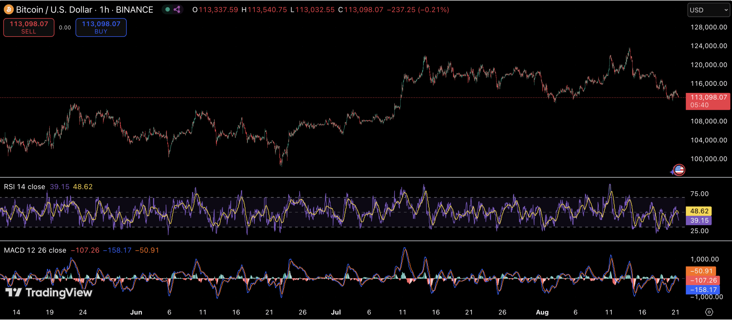 Bitcoin continues to trade under pressure, sliding to $113,089 after failing to hold recent resistance levels.
