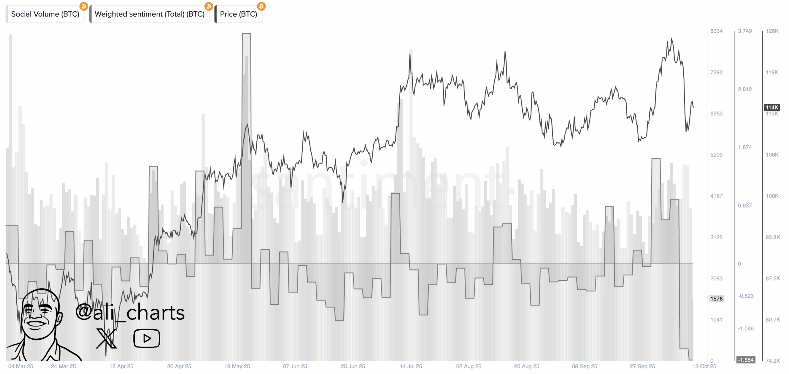 Bitcoin’s sharp downturn last week has triggered one of the steepest drops in social sentiment in recent years, according to data shared by on-chain analyst Ali Martinez.
