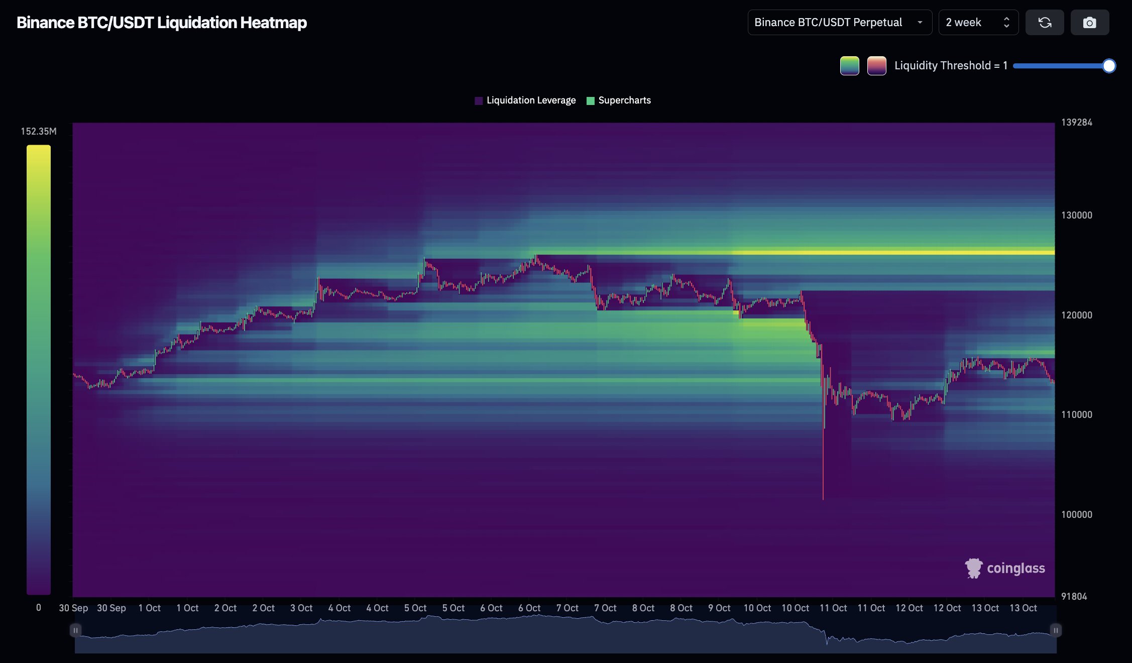 Data from Santiment shows that Bitcoin’s social volume has also declined significantly since early October, marking a clear shift in market psychology. The crash coincided with a massive selloff seen on Binance futures, where liquidation heatmaps from Coinglass reveal hundreds of millions in leveraged long positions were wiped out as Bitcoin briefly plunged below $110,000 before stabilizing near $111,000.