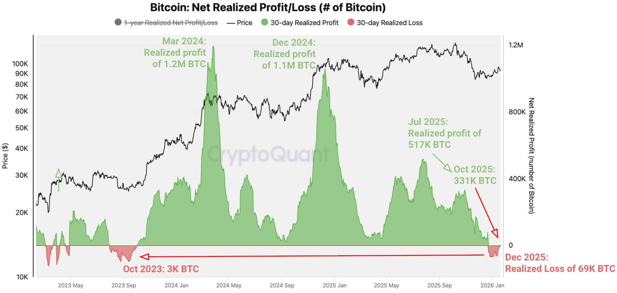 In sharp contrast to whale behavior, data from CryptoQuant shows that many Bitcoin investors have started losing money again on a realized basis. Since December, holders have realized roughly 69,000 BTC in losses, equivalent to about $6.1 billion, marking the first sustained loss period since October 2023.