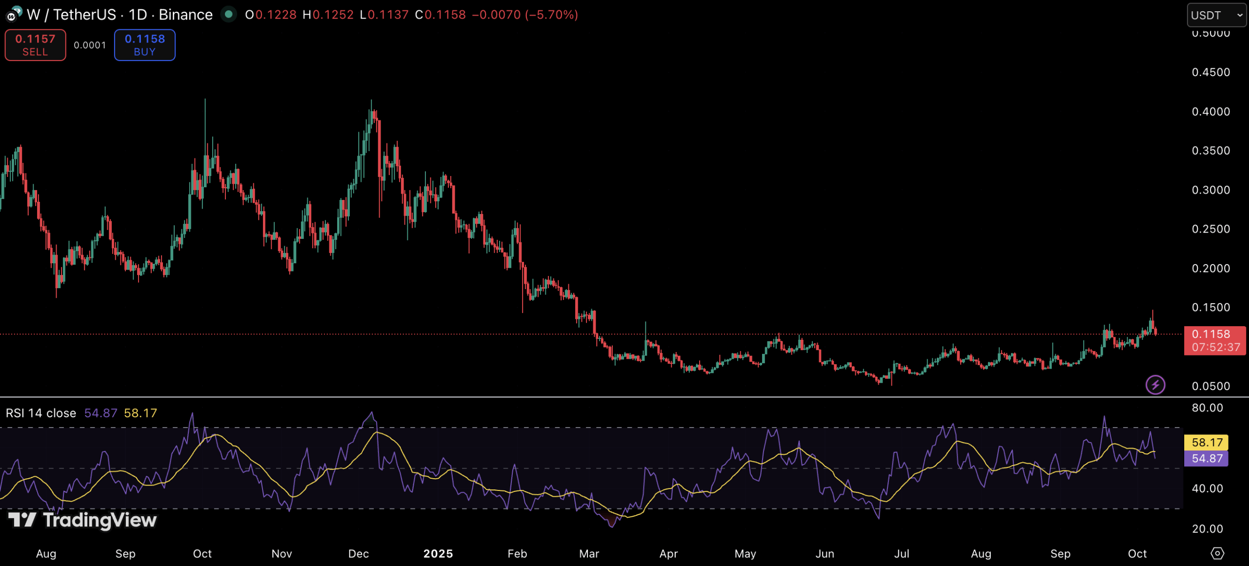 Recent price data supports this view. After a prolonged consolidation period, $W broke above previous resistance zones, confirming a new higher high on the daily chart. Although the price temporarily retraced to around $0.116, the overall structure remains bullish.