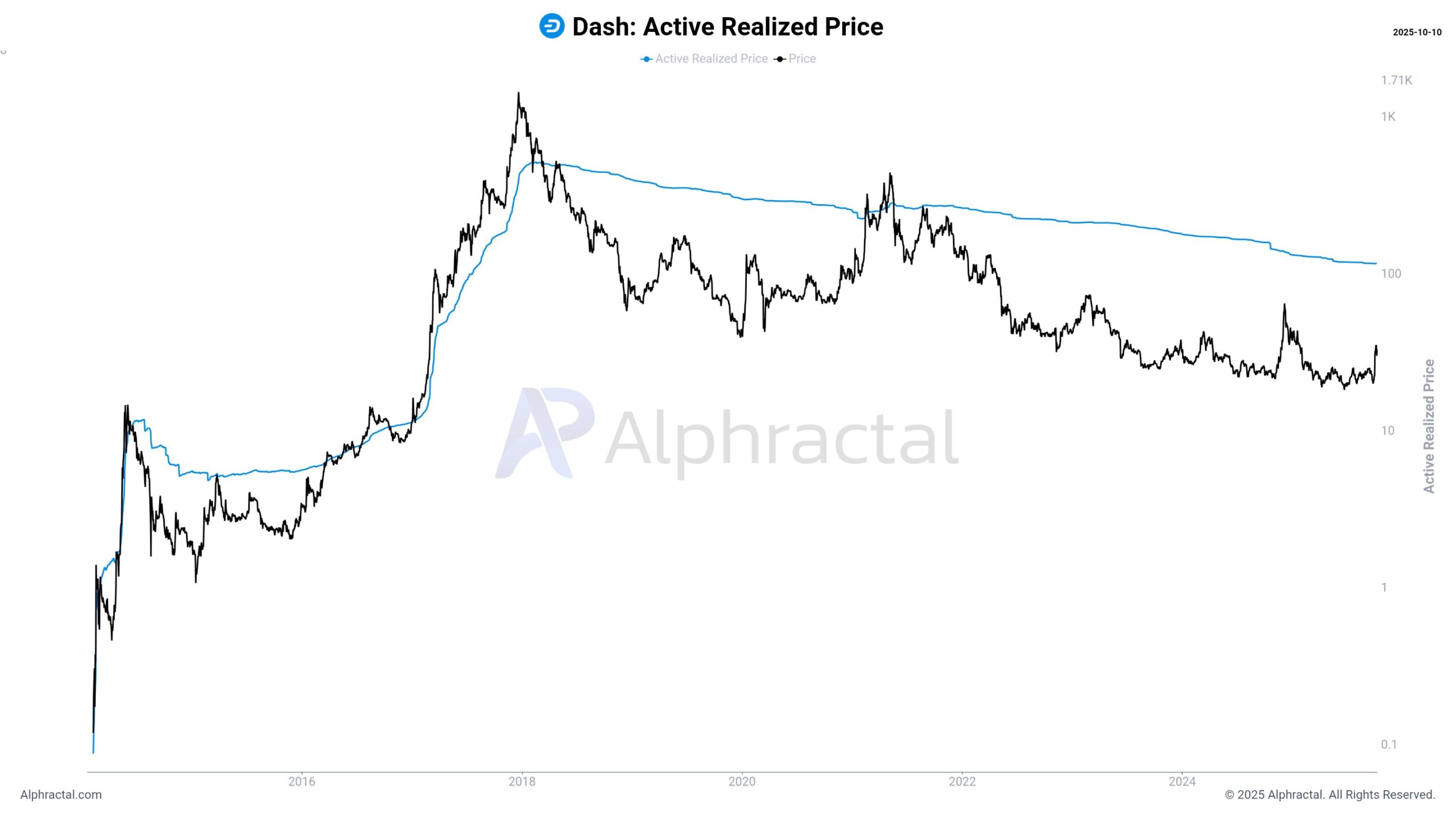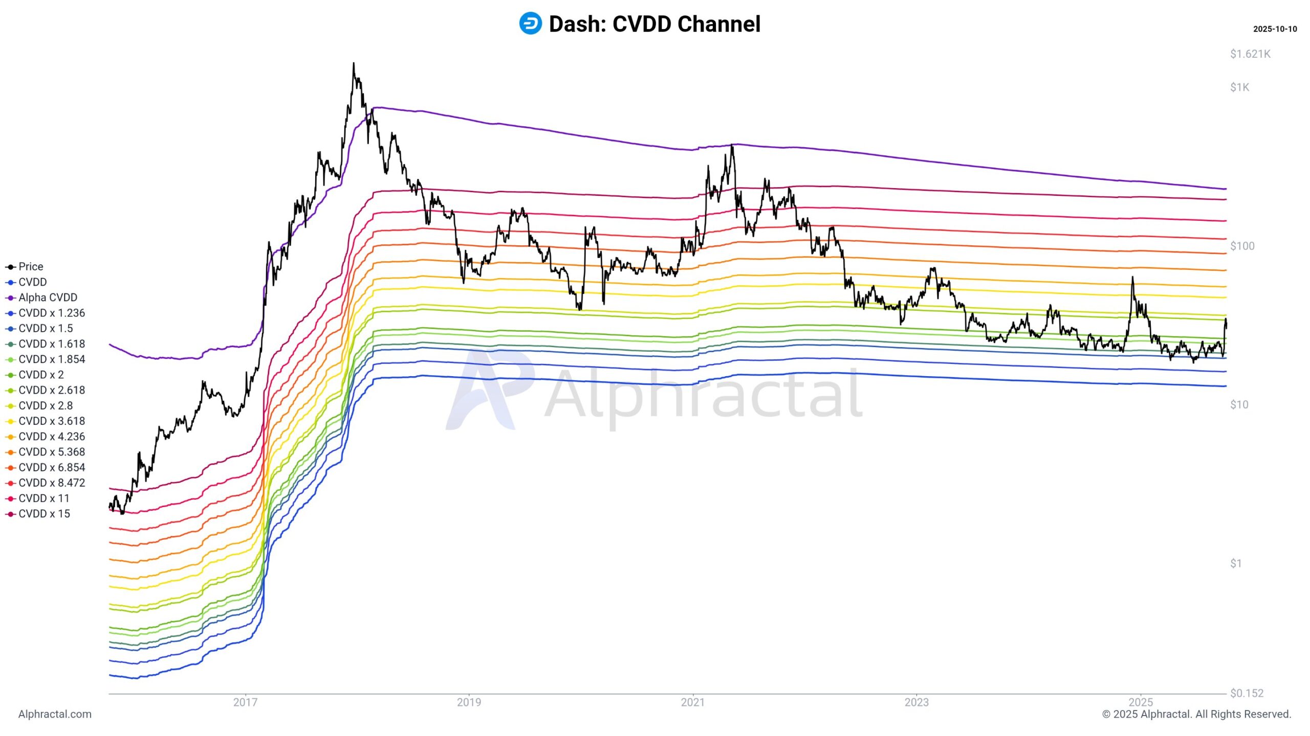 Charts shared by Alphractal indicate that Dash’s CVDD (Cumulative Value Days Destroyed) bands are tightening – a pattern that in previous cycles preceded strong rallies. Historically, similar compression phases have led to substantial upside movements once the realized price was reclaimed.