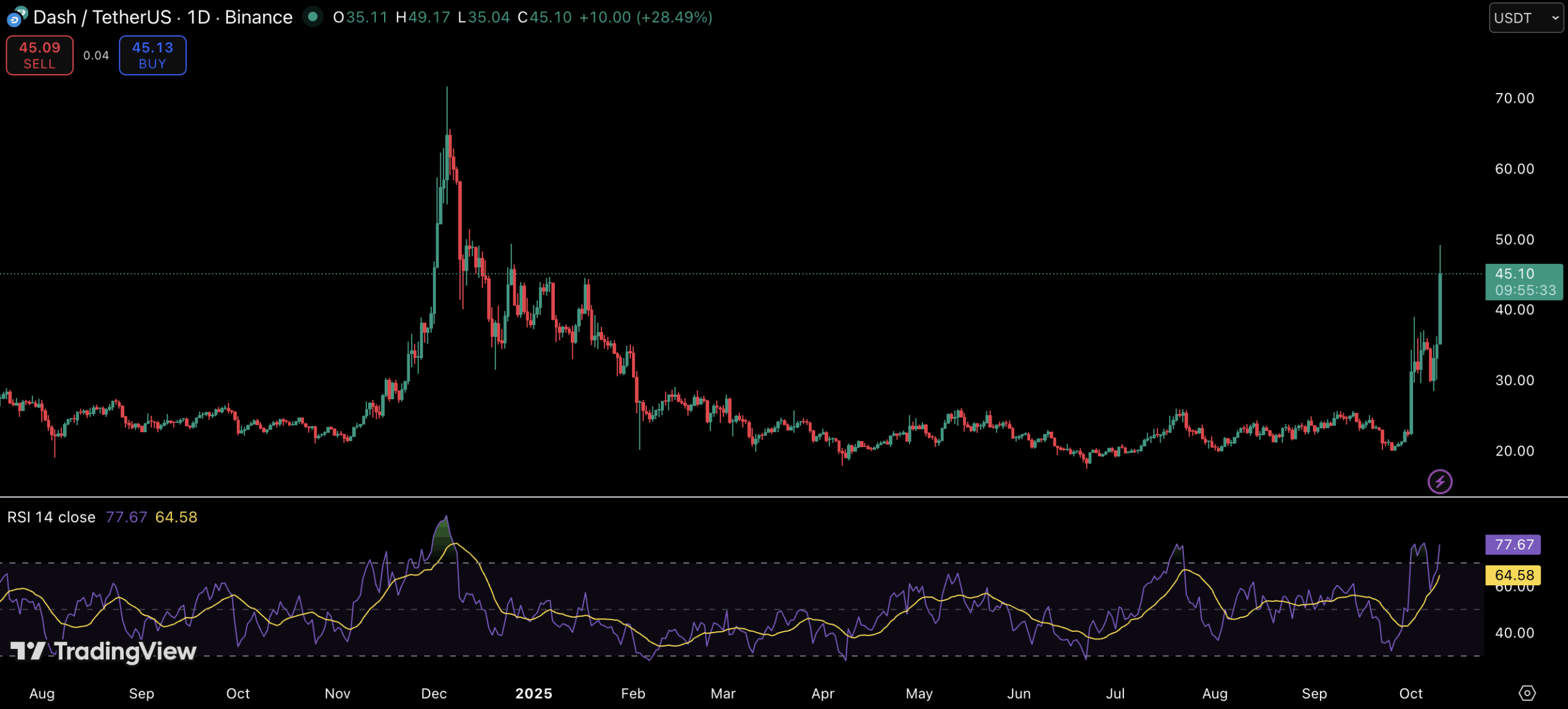 Dash has staged a strong comeback this week, rising nearly 30% in 24 hours to trade around $45.