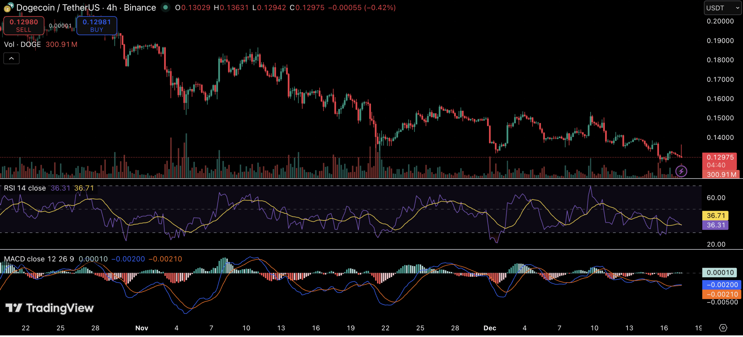 On lower timeframes, Dogecoin continues to trade under pressure. The 4-hour chart shows a clear sequence of lower highs, reflecting fading momentum since the recent local peak near the mid-$0.15 area. Volume has also thinned out, suggesting a lack of aggressive buyers at current levels.