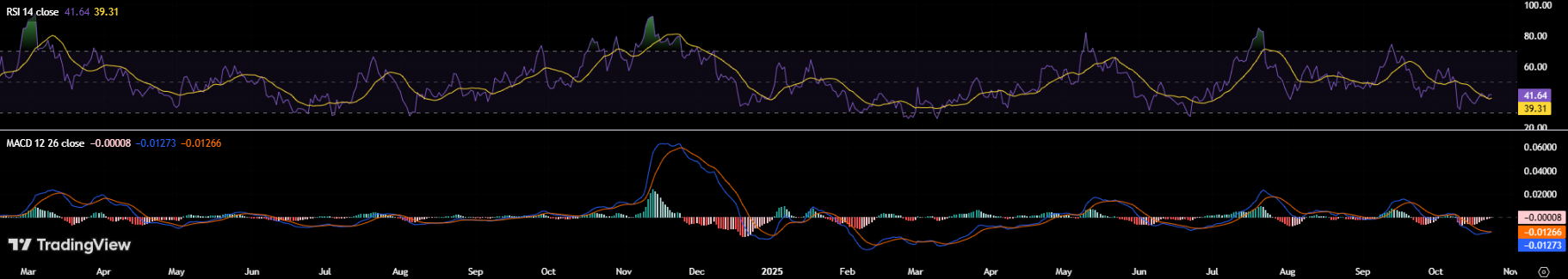 The Relative Strength Index (RSI) sits near 41, suggesting mild selling pressure without reaching oversold conditions. Meanwhile, the MACD remains below the signal line with negative momentum, indicating that buyers are not yet returning to the market.