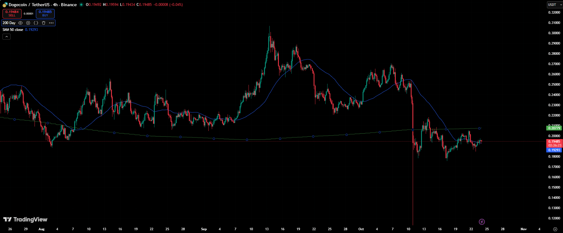 Dogecoin’s price continues to struggle following a steep 36% correction from its September high. The meme-inspired cryptocurrency has dropped from $0.30 to around $0.19, signaling that sellers remain firmly in control despite occasional attempts at recovery.
