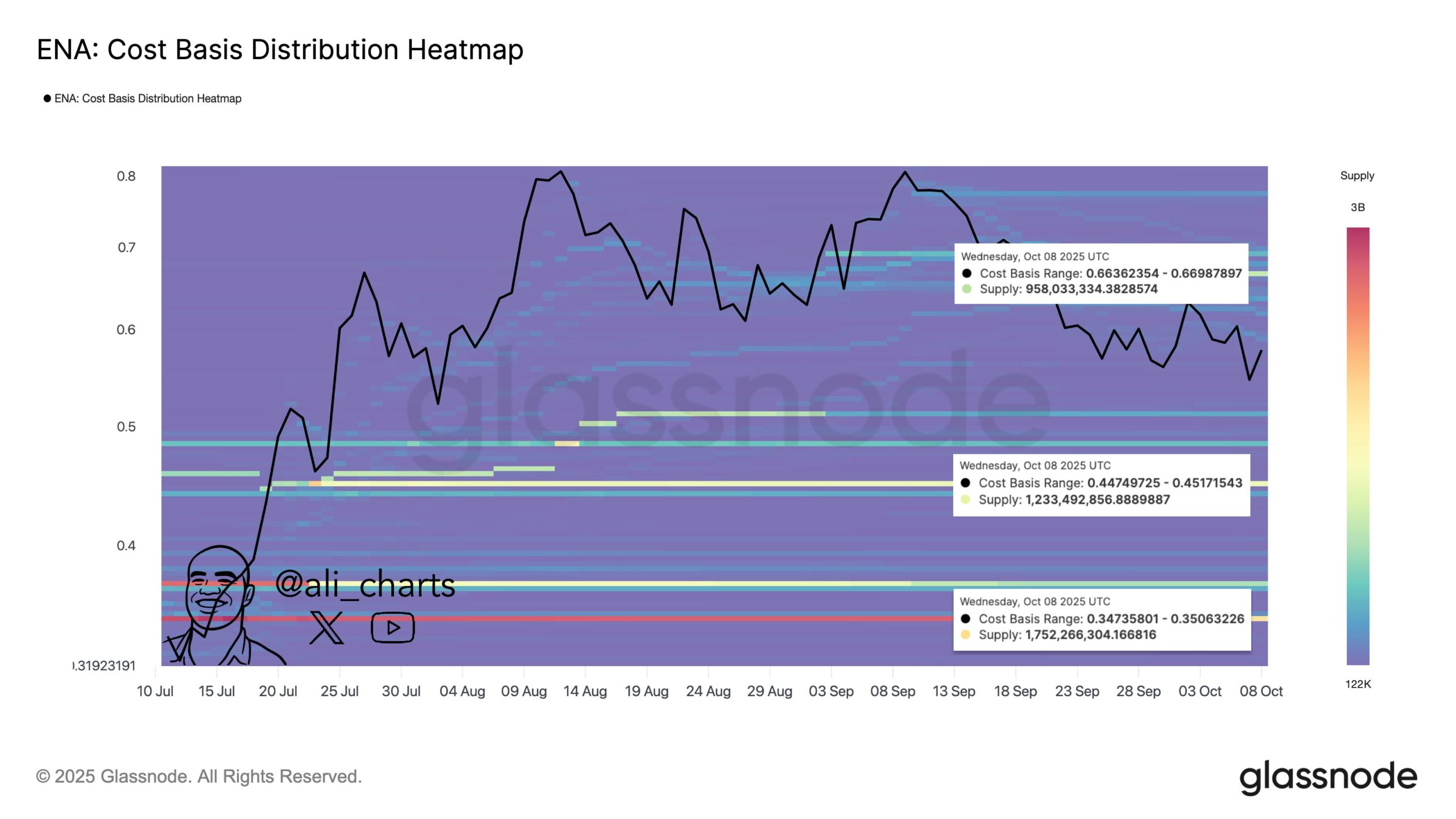 Data from Glassnode’s cost basis heatmap indicates that a large concentration of addresses accumulated ENA between these lower bands, suggesting potential buying interest if prices revisit those levels.