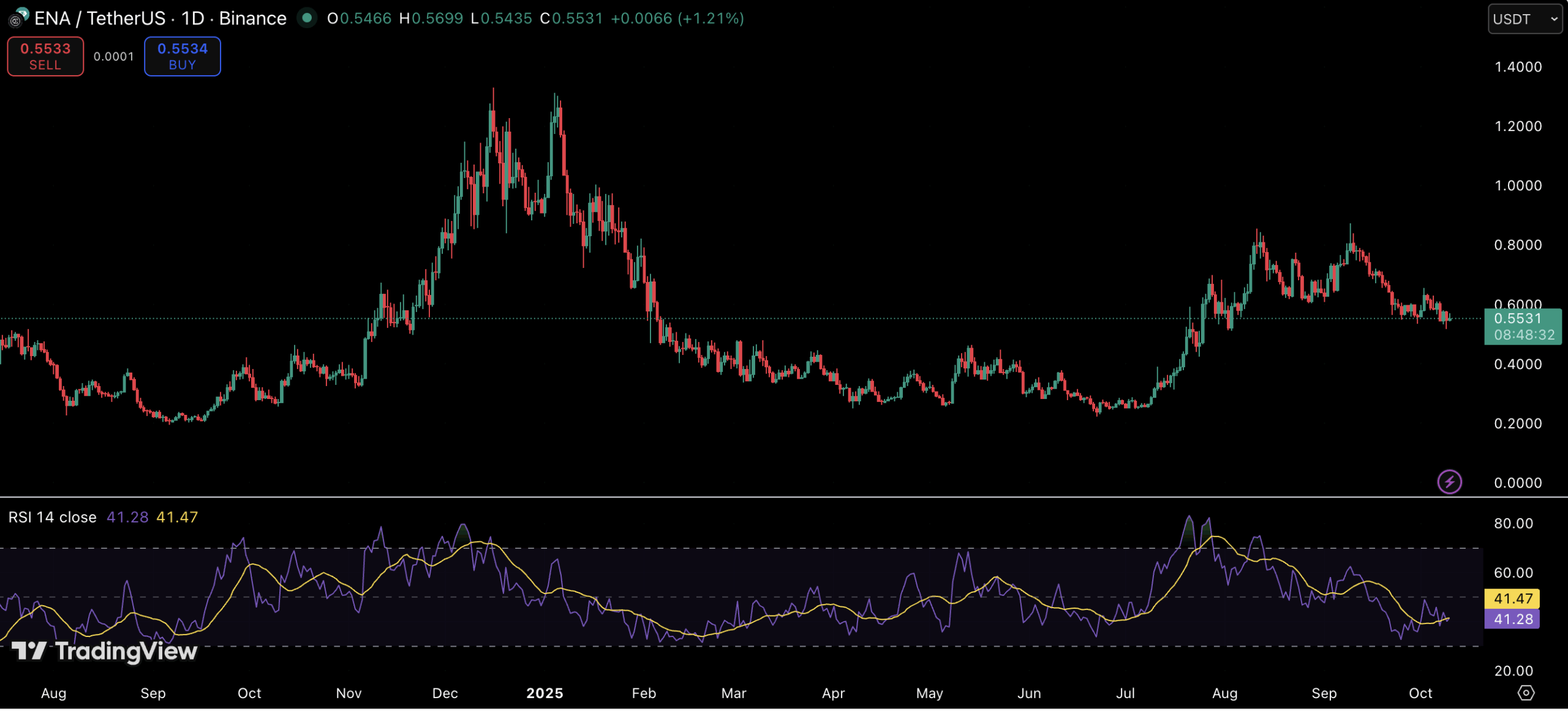 The Relative Strength Index (RSI) currently sits around 41, reflecting subdued momentum after weeks of decline. Historically, similar RSI levels have coincided with accumulation phases before notable price rebounds. However, until ENA breaks above its short-term moving average resistance, sideways trading remains the most likely scenario.