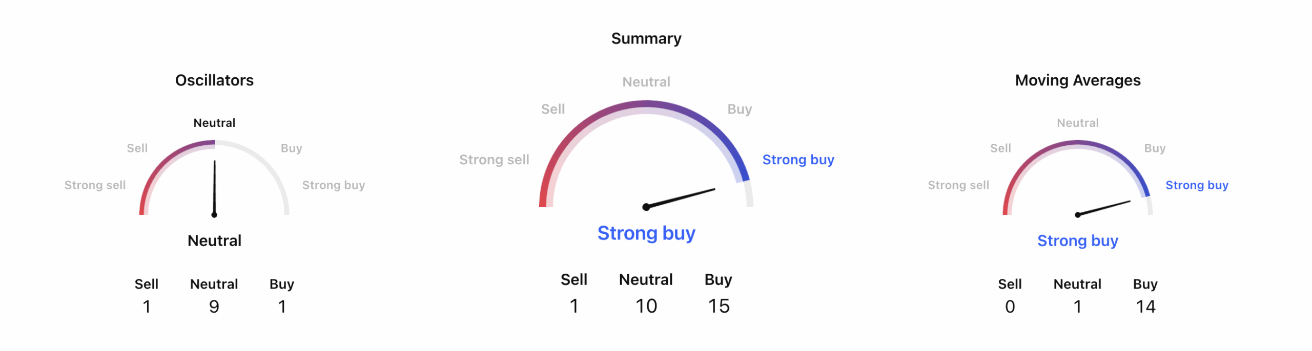 The 1-day technical analysis from TradingView shows a bullish picture – the summary and moving averages point to “strong buy” with 15 and 14 signals, respectively.