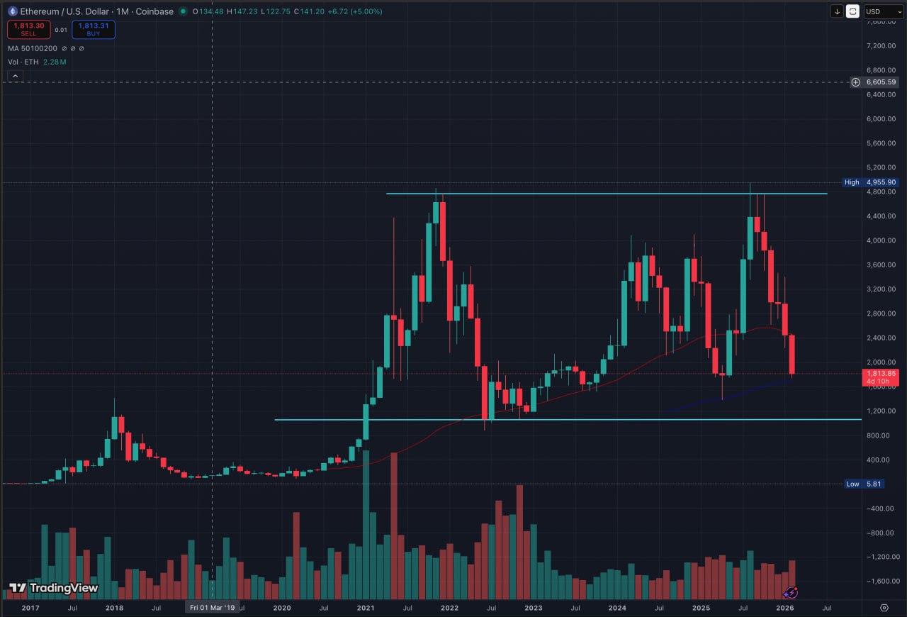 If Ethereum were to lose this level on a monthly closing basis, the technical structure would confirm the double top pattern, potentially opening the door to a deeper corrective phase. In classical technical analysis, the measured move following a confirmed double top can be significant, often matching the height of the formation.