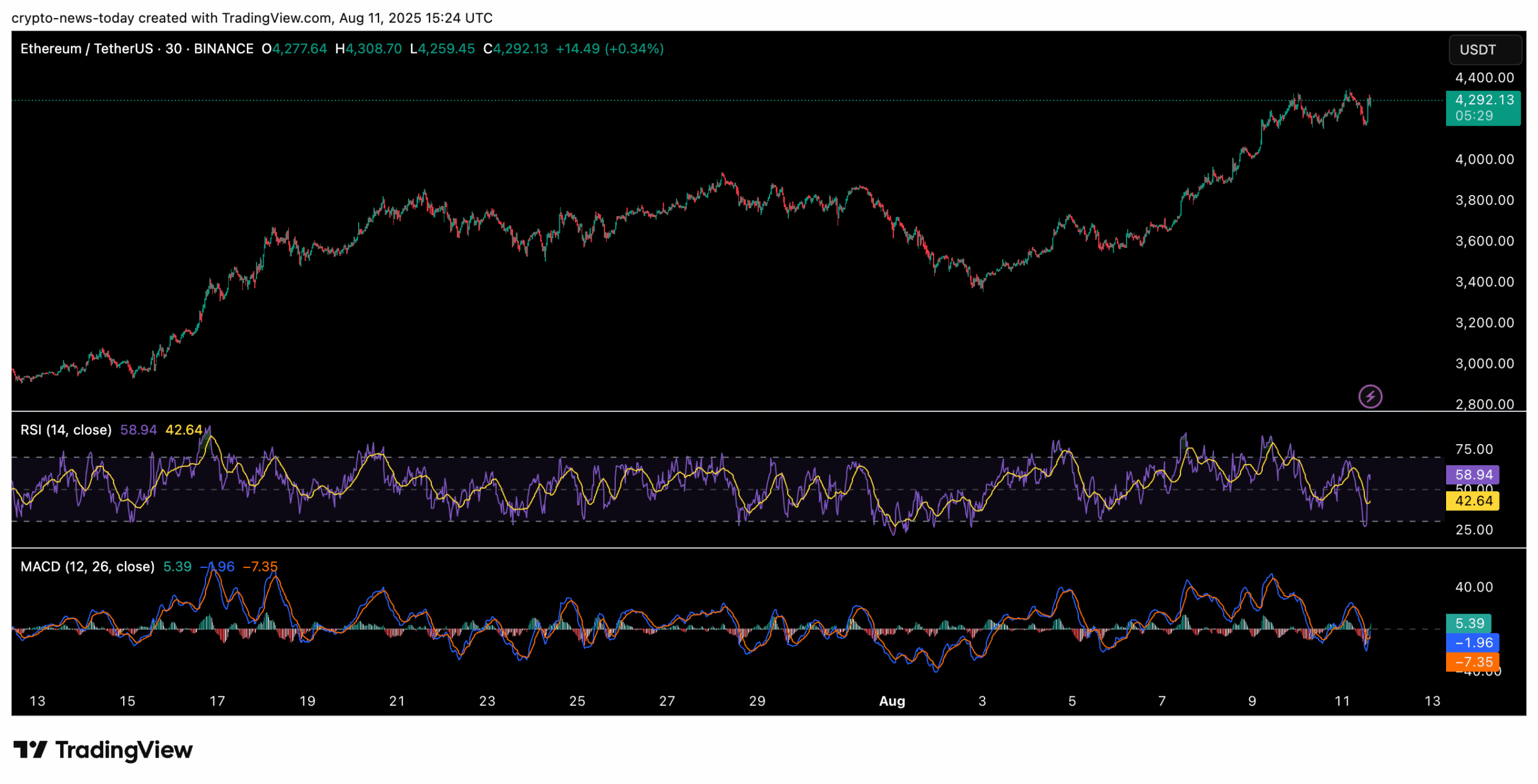 Ethereum (ETH) is trading at $4,300, up 18% over the past week, with its market capitalization climbing to almost $520 billion.