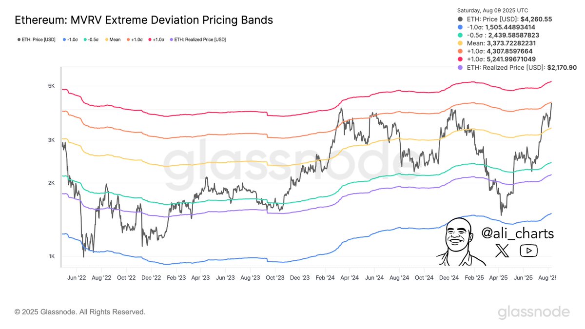 On-chain analyst Ali highlighted that surpassing $4,307, based on Ethereum’s MVRV Extreme Deviation Pricing Bands, could propel the price straight to $5,241.