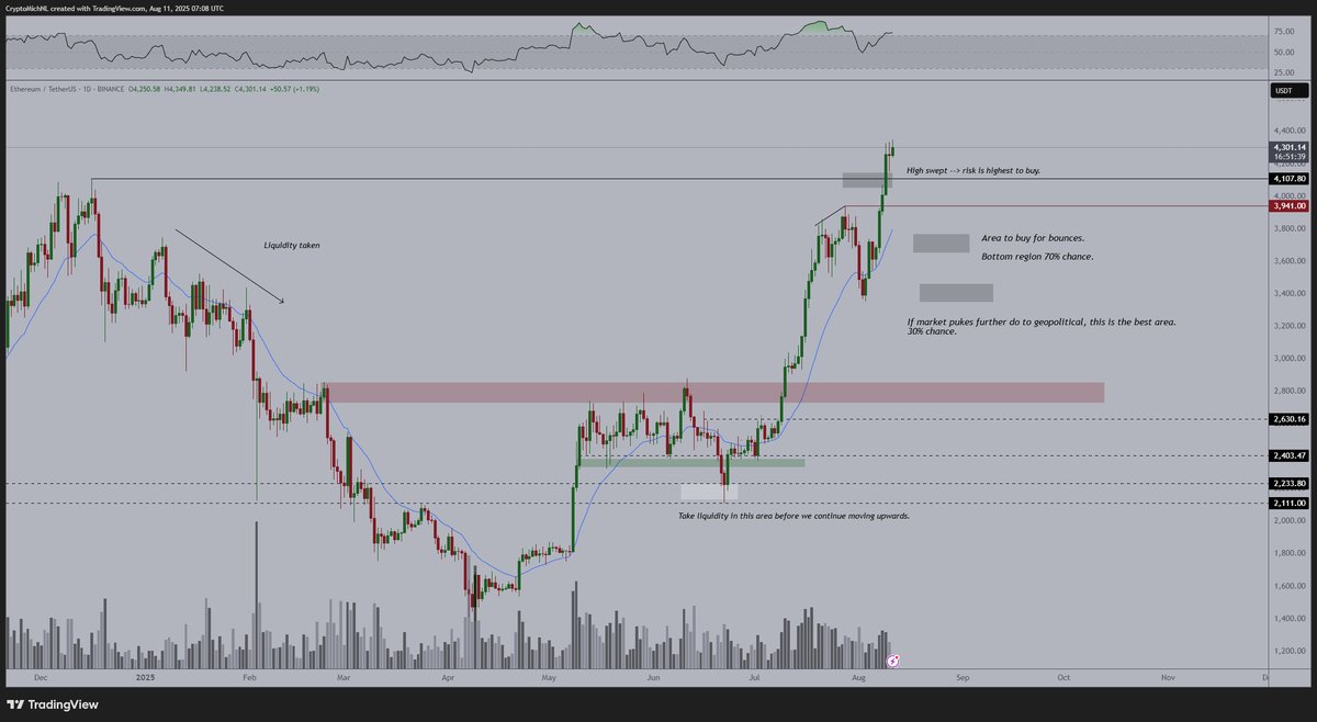 He suggests that if Bitcoin undergoes a correction, Ethereum could retrace toward the $3,700–$3,800 range, which he considers a prime accumulation zone before resuming its upward trajectory.