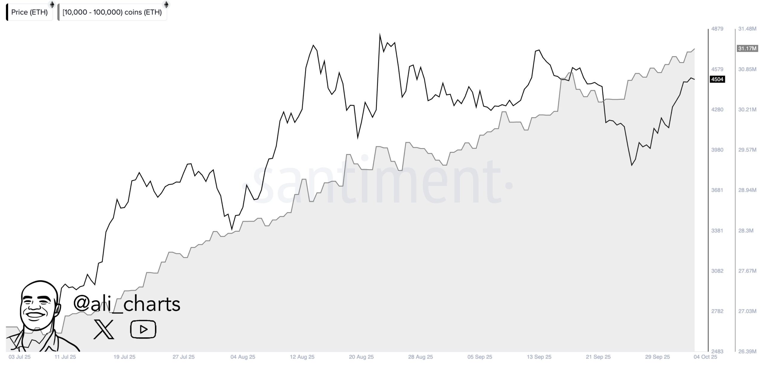 According to market analyst Ali, wallets holding between 10,000 and 100,000 ETH have been the main drivers of this accumulation phase. The buying spree coincides with Ethereum’s price advancing more than 12% over the past seven days, currently trading at $4,515 with a total market capitalization of $545 billion, according to CoinMarketCap.