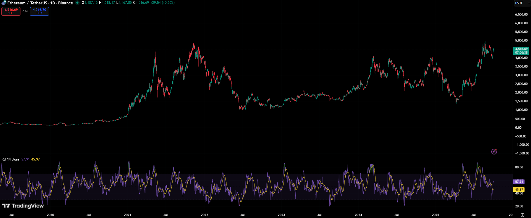 Ethereum’s upward trajectory follows a period of steady recovery across the broader crypto market. Technical charts show ETH approaching resistance near the $4,600 level – a zone that, if broken, could pave the way toward retesting the all-time high set in late 2021.