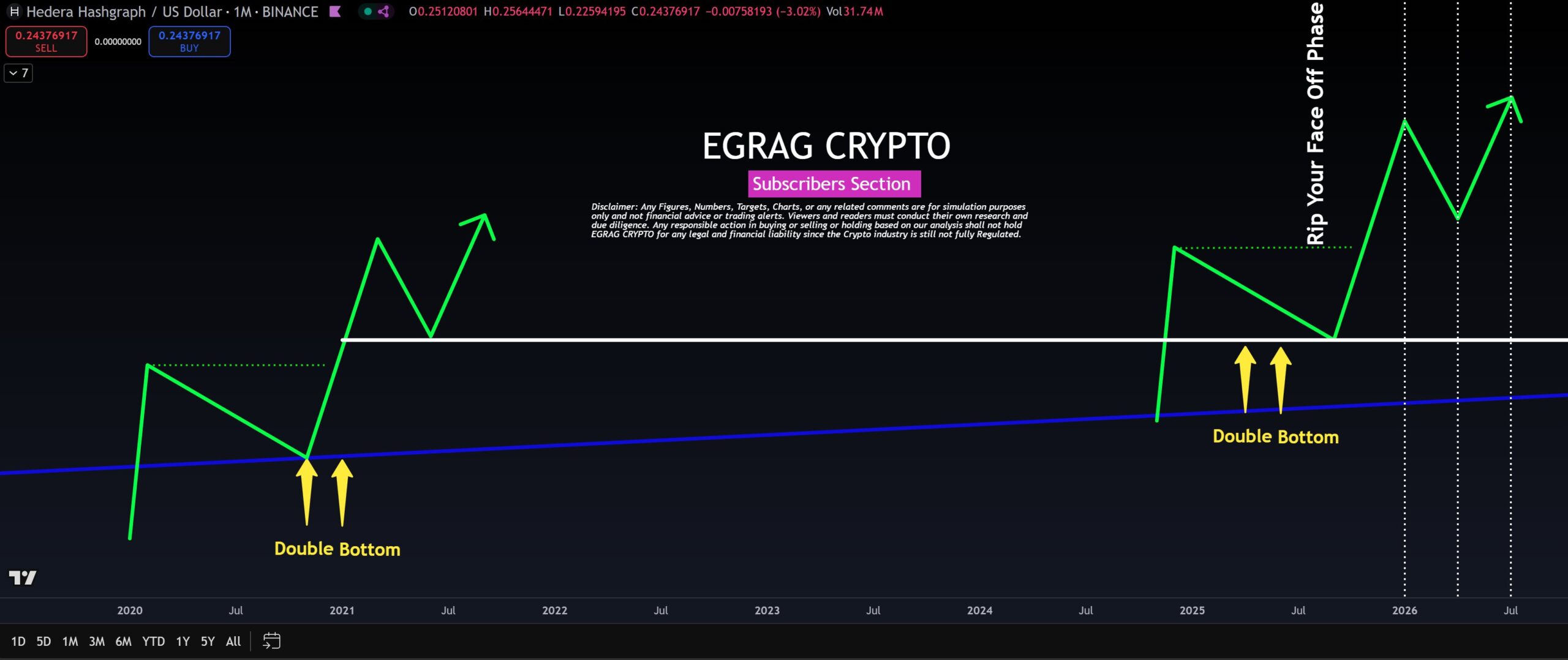 One of the shared charts also highlighted a “Double Bottom” pattern forming — a classic bullish signal. If confirmed, it could support a significant breakout, consistent with past cycles. The analyst mapped the next possible wave based on previous pattern-to-pattern similarities, pointing to a “Rip Your Face Off Phase” that could begin as early as mid-2026.