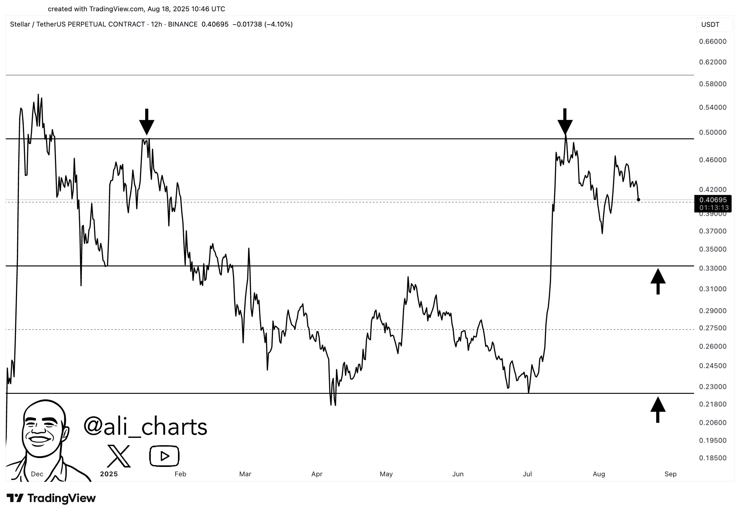 Stellar (XLM) is struggling to hold above the $0.40 level after dropping nearly 8% in the past week, with analysts pointing to strong resistance at $0.42 and downside risk toward $0.33 if bearish momentum continues.