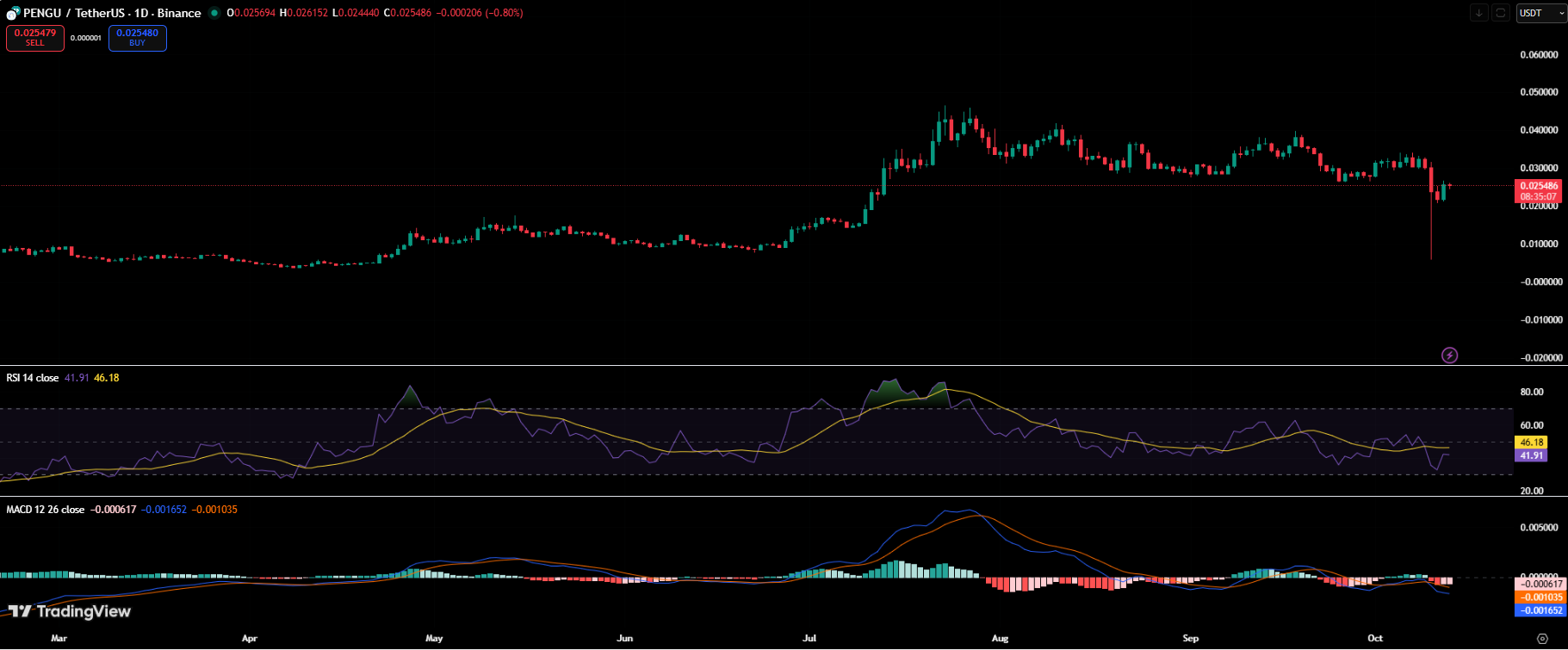 On the daily chart, PENGU is currently trading around $0.025, recovering from a sharp intraday low near $0.01 during the flash crash.