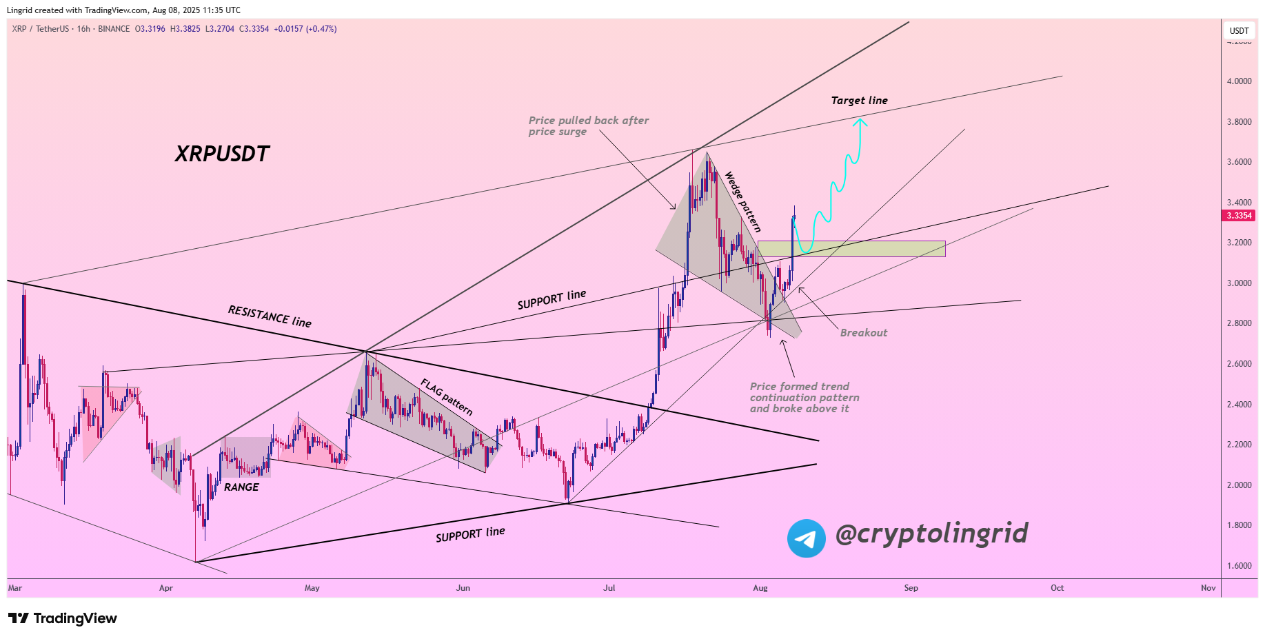 On the technical side, XRP has rebounded strongly from its recent wedge pattern breakout, reclaiming the $3.20 zone as support after a healthy pullback. Price action now shows consolidation above this key level, maintaining its position within a broader ascending channel.