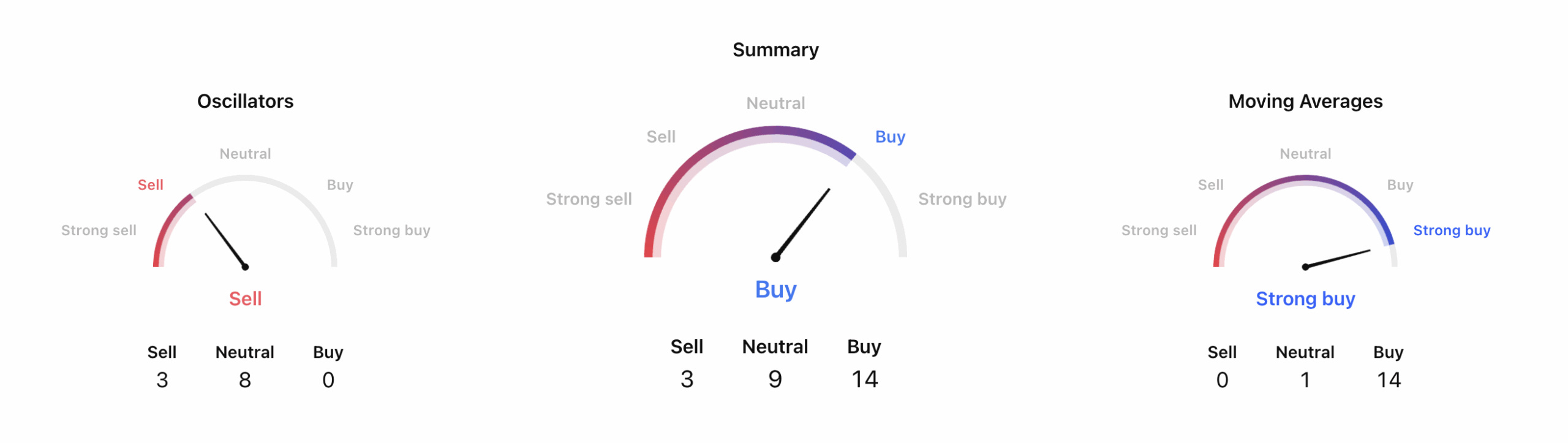 The 1-day technical analysis from TradingView shows rather bullish sentiment – the summary points to “buy” with 14 signals, moving averages show “strong buy” with 14, and oscillators are at “sell” with 3.