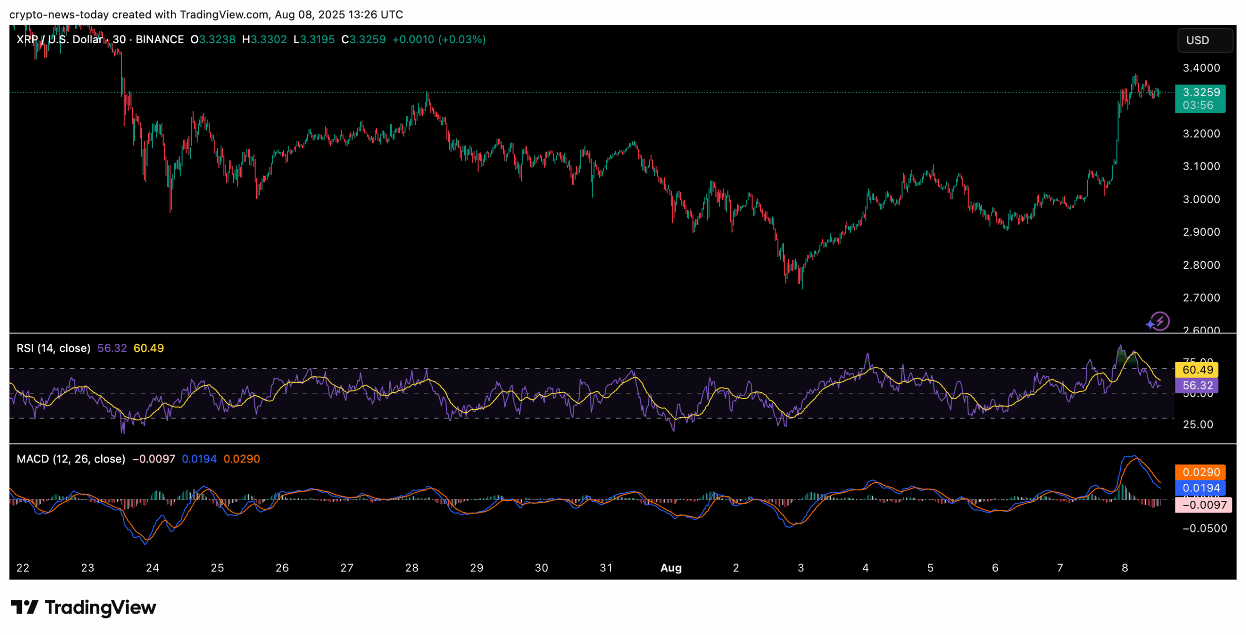 XRP has staged a sharp rally, climbing 8% in the past 24 hours to $3.32, after a major breakthrough in the long-running legal battle between Ripple Labs and the U.S. Securities and Exchange Commission.