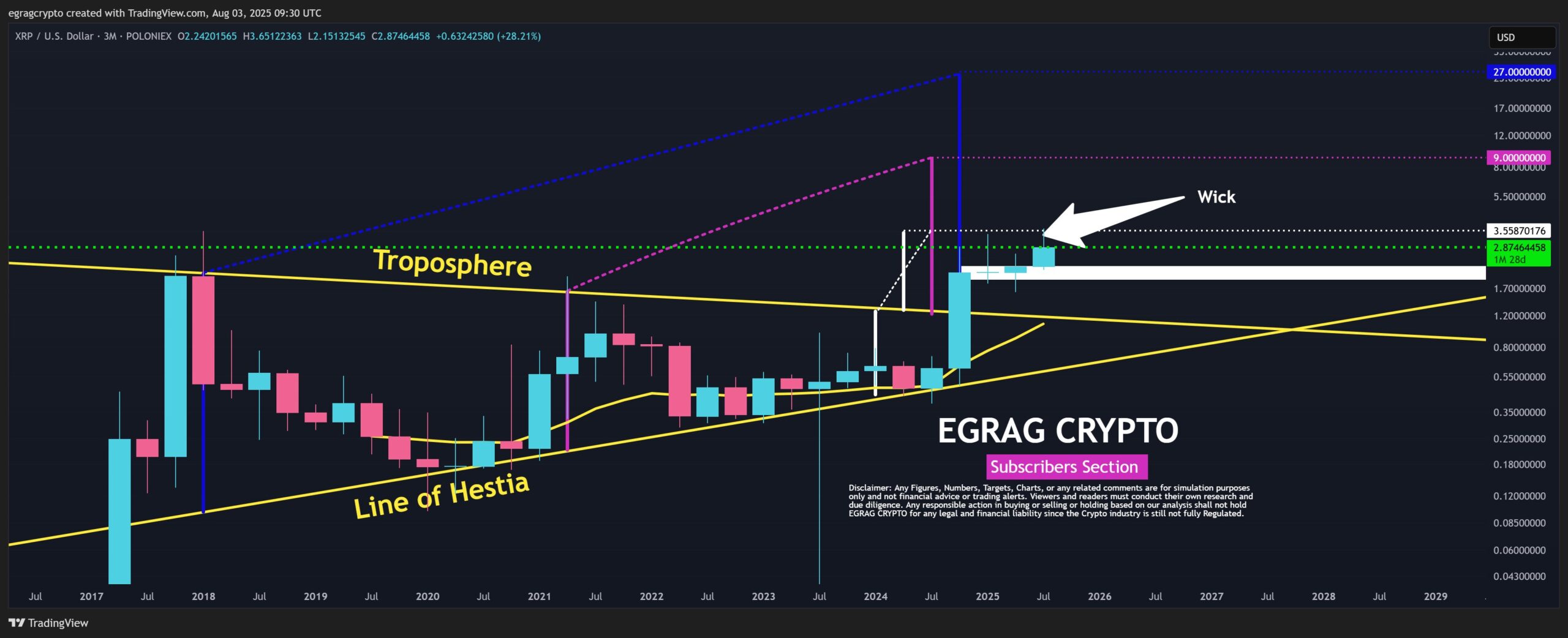 EGRAG’s chart analysis highlights key trendlines, including the “Line of Hestia” and the “Troposphere” range, showing XRP holding strong above crucial support levels. His outlook implies that the current consolidation could be laying the groundwork for a significant rally, potentially targeting much higher price zones.