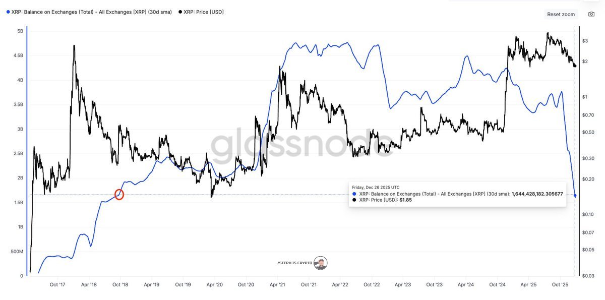 On-chain data adds an interesting layer to the picture. Data visualized by Glassnode shows XRP balances on exchanges trending sharply lower, a sign that fewer tokens are readily available for immediate selling.
