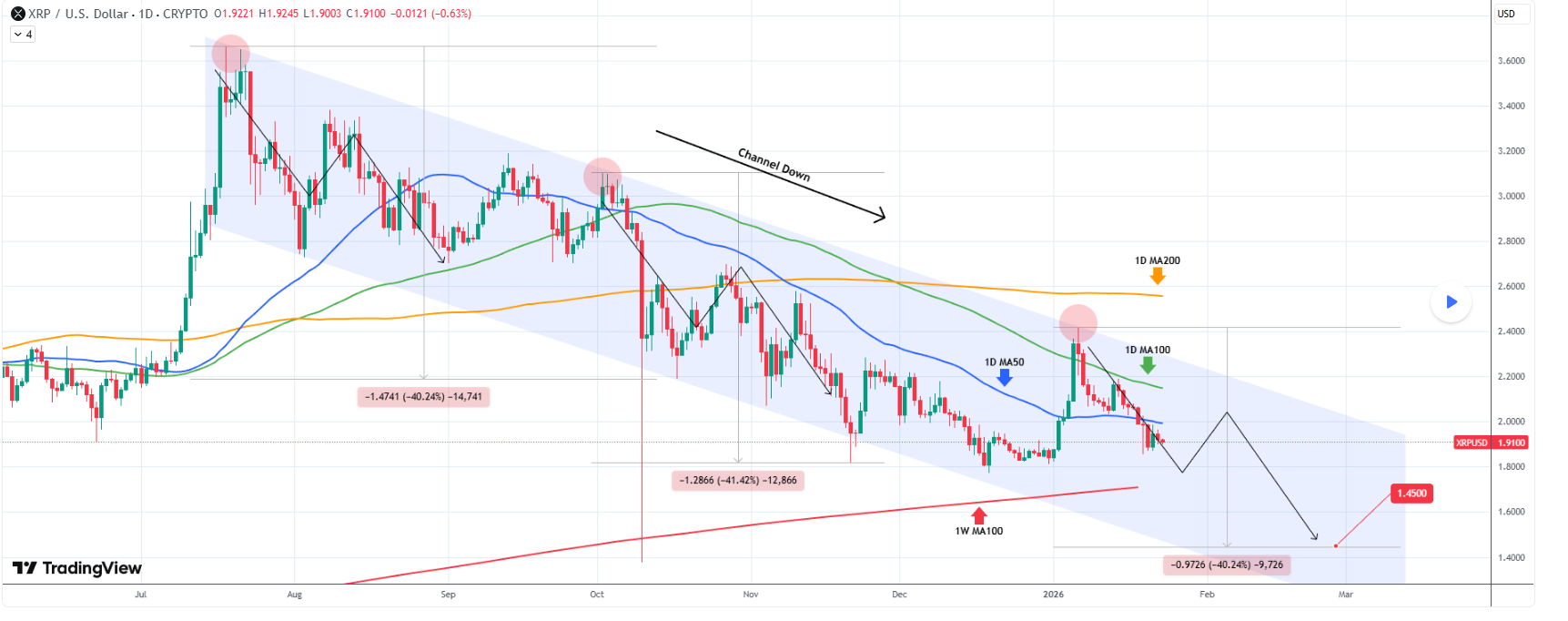 If the 1-week MA100 fails to hold, XRP could be setting up for a deeper continuation move. Based on the size of prior bearish legs within the same channel, a decline of roughly 40% would not be out of character. That scenario would place downside targets near the 1.45 area, a level that aligns with the lower boundary of the broader descending structure.