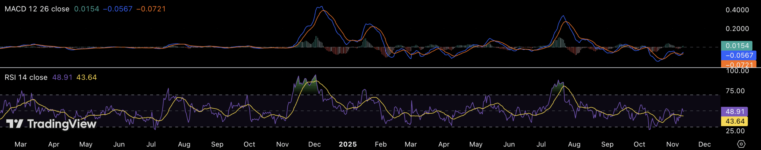 Supporting this thesis, the latest momentum indicators show that XRP may be preparing for another leg higher. The daily Relative Strength Index (RSI) sits near 49, suggesting neutral conditions rather than overbought weakness. Meanwhile, the MACD histogram is turning positive, indicating a possible shift in momentum toward buyers.
