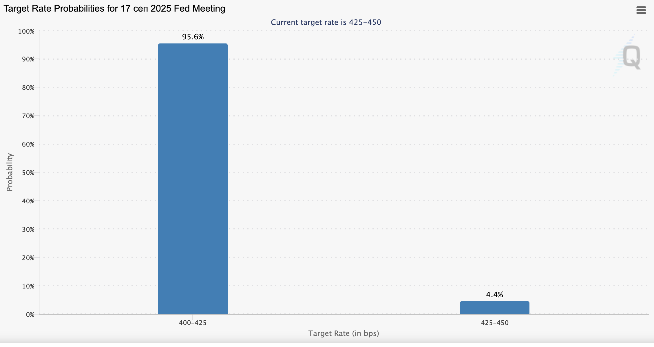 Expectations for a Federal Reserve rate cut in September have reached overwhelming consensus, with the CME FedWatch Tool showing a 95.6% probability of a 25-basis-point reduction.