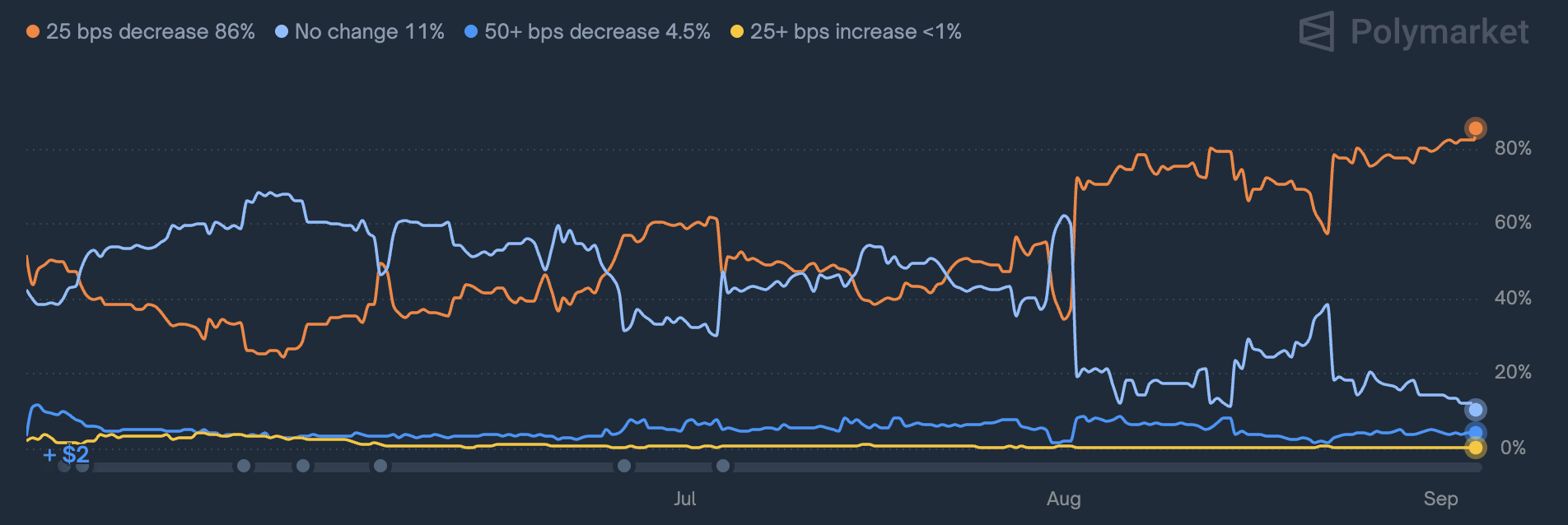 The Polymarket chart shows conviction has strengthened since August, with traders steadily shifting toward the smaller cut as the most probable scenario.