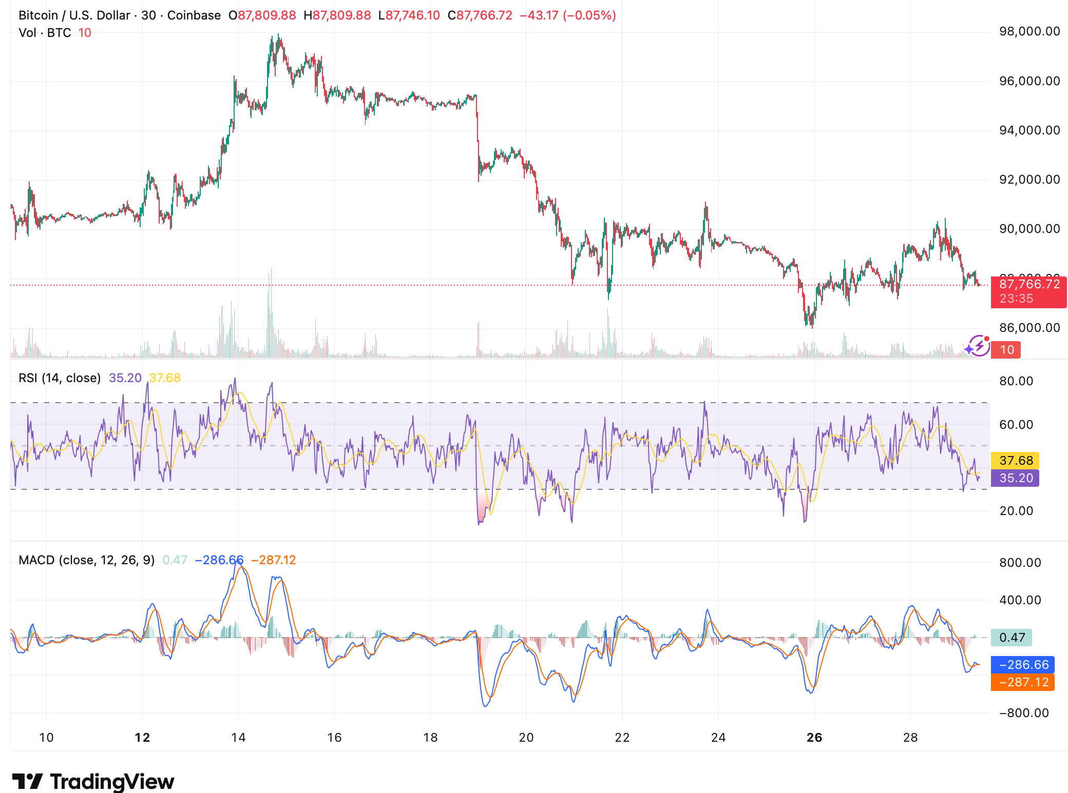 The Moving Average Convergence Divergence remains negative, confirming bearish momentum in the short term, but the flattening histogram suggests downside pressure may be stabilizing. On the price level side, the $86,000–$87,000 zone stands out as a critical support area that has already attracted buyers multiple times. Resistance remains layered near $90,000, with a more significant barrier around $94,000.
