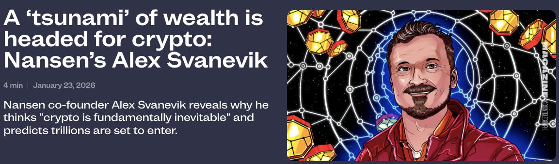 Speaking to CoinTelegraph’s Magazine, Svanevik described the coming inheritance cycle as a “tidal wave” forming offshore, driven by demographics rather than speculation. Over the next few decades, an estimated $100 trillion held by Baby Boomers is expected to pass to Millennials and Gen Z.