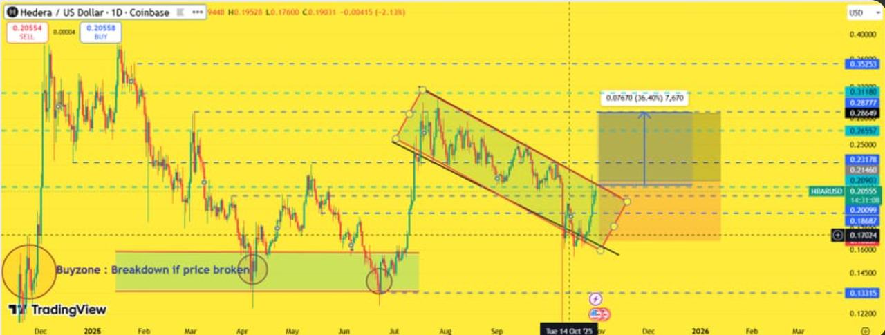 HBAR is up 6.7% in 24 hours as ETF interest and on-chain use increase. Since October 22, HBAR has climbed about 31% from $0.16 to $0.21 with eight straight green candles. Volume spiked to 1.74 billion on October 29, while TVL rebounded above 102 million. ETF inflows near 2.2 million show confidence returning. A daily close above $0.20 would keep HBAR in control.