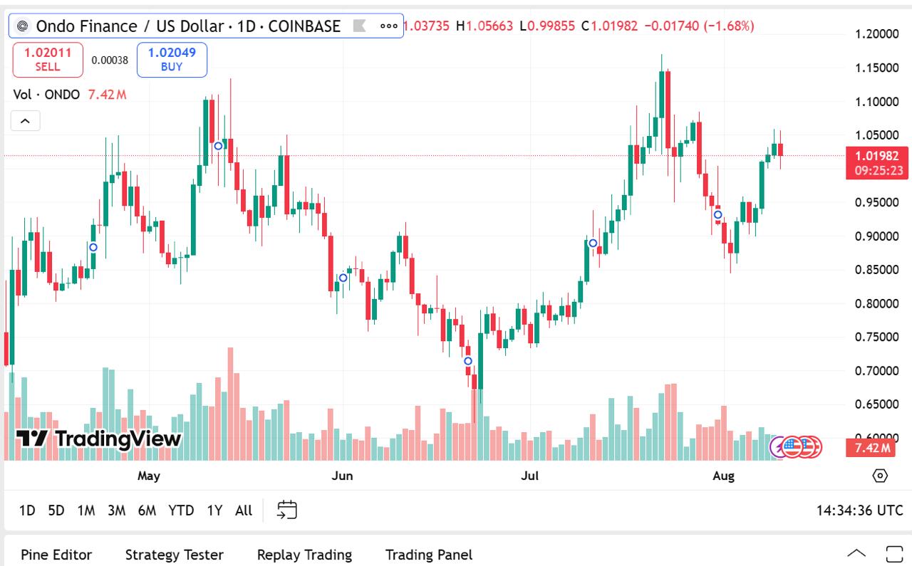 ONDO is priced at $1.00 now, off 3.13%, and its market cap is $3.17 billion. Despite this decline, ONDO’s trading volume has risen by 10.72% to nearly $190 million as evidence of strong investor appetite even amidst the price correction.
