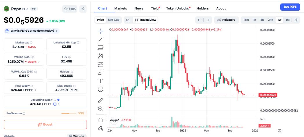 As of Nov 12, PEPE is trading around $0.000005954 with a market cap sitting at approximately 2.5 billion dollars.