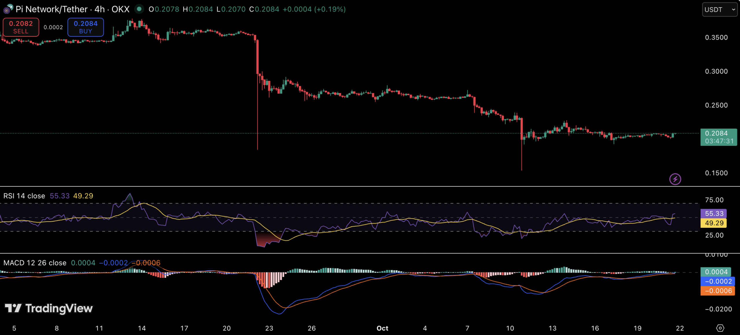 At the time of writing, Pi trades around $0.2077 with a market cap of $1.72 billion. The RSI sits near 54, while the MACD shows a neutral crossover – suggesting a balance between buyers and sellers.