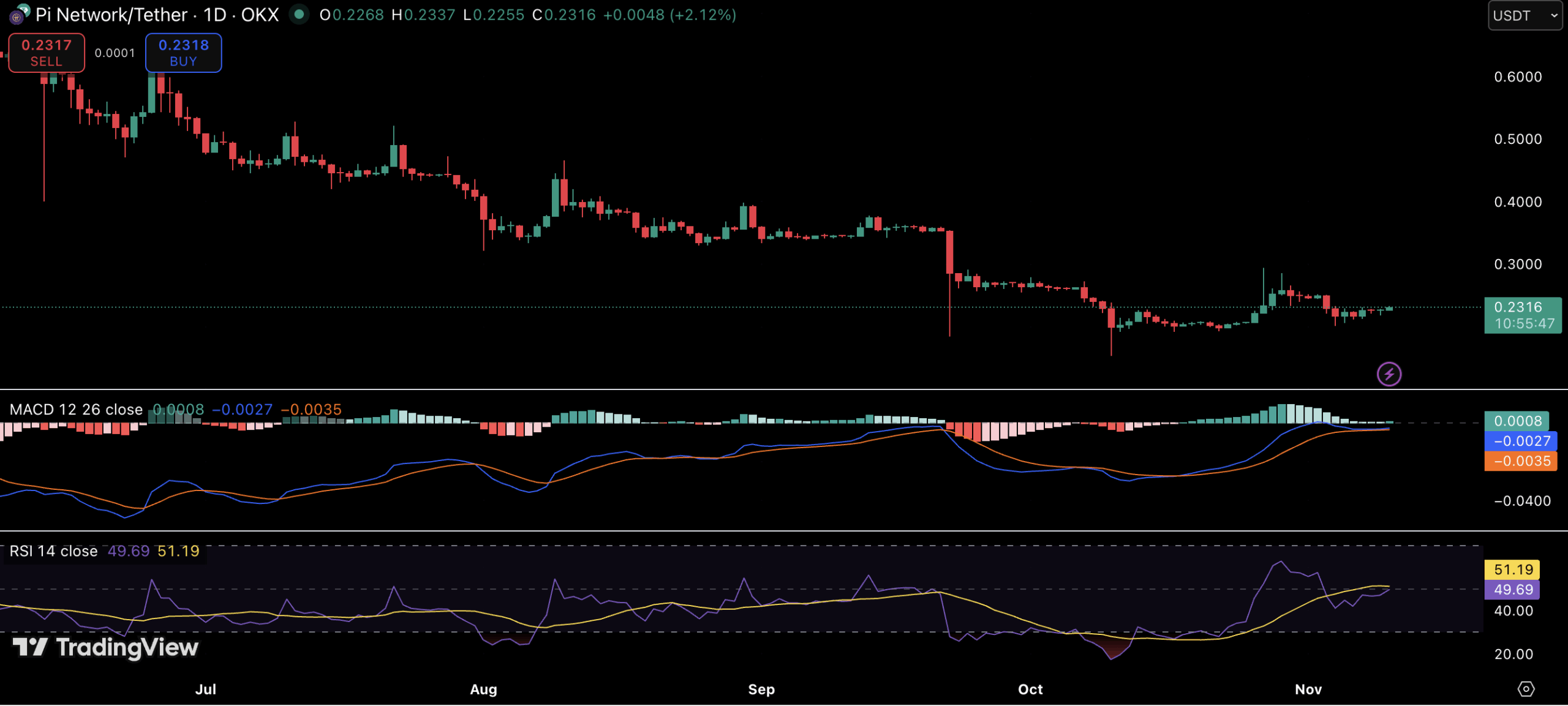 Pi’s chart shows that the token has been consolidating since early November after months of decline. The last significant drop came in mid-October, when the price briefly touched $0.20 before rebounding. Since then, Pi has established a narrow trading range between $0.22 and $0.24, suggesting that a new accumulation phase may be forming.